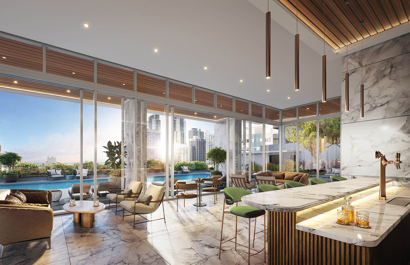 - Vistas al skyline: “Residencias con vistas ininterrumpidas al downtown, Brickell, Biscayne Bay y el Atlántico.”